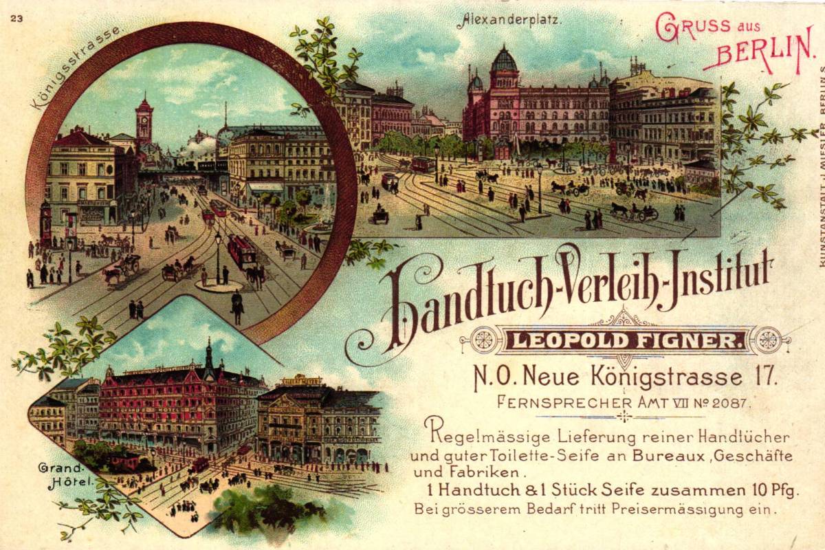 Berlin, Farb-Litho, Werbung „Handtuch-Verleih-Institut Leopold Figner“, um 1900/05, nicht beschriftet, nicht gelaufen, einwandfreie Erhaltung. Eine interessante und nicht alltägliche Karte !