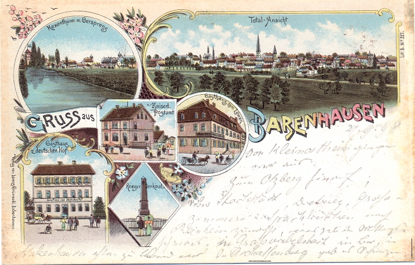 Babenhausen, Farb-Litho mit Gasthaus „Zum Dt. Hof“, um 1900, rückseitig beschriftet, nicht postalisch gelaufen, rechts ganz leichter Bug am Rand, nur wenig sichtbar, sonst einwandfreie Erhaltung.
