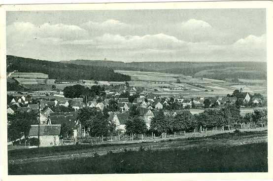 Brachttal – Schlierbach, Totale, versandt als Feldpostkarte (1940) in Hellstein, Landpoststempel „Hellstein über Wächtersbach“, links ca. 1cm Einriss, links oben und unten größerer Bug, rückseitig größere Anklebestelle.