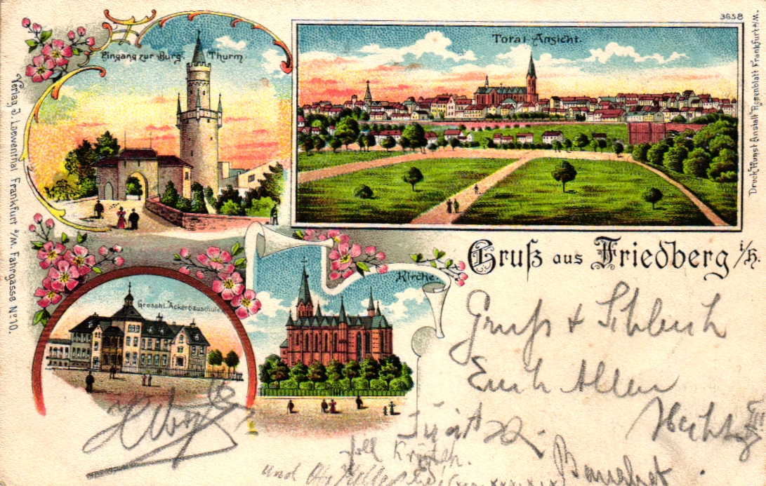 Friedberg in Hessen, Farb-Litho mit Ackerbauschule, Bahnpost Cassel-Frankfurt, 1900 nach Darmstadt versandt, einwandfreie Erhaltung.