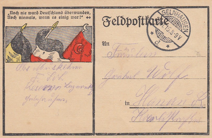 Gelnhausen, illustr. Feldpostkarte nach Hanau, 1915, interessante Karte incl der türkischen Fahne, nur sehr kleine Altersspuren.