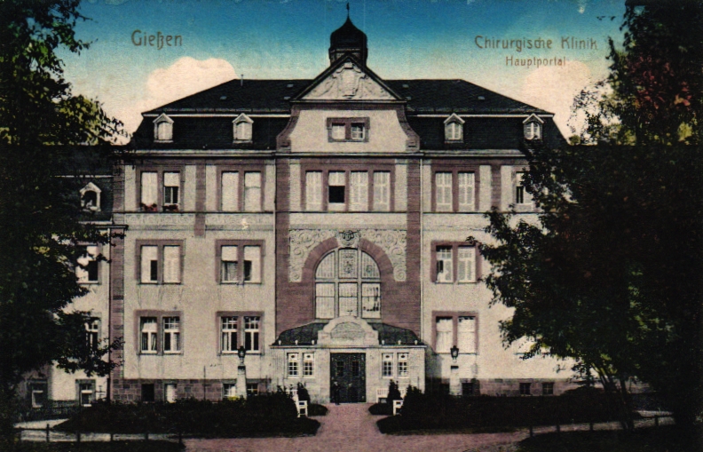Giessen, Chirurgische Klinik, Hauptportal, um 1910/20, rückseitig beschriftet, nicht postalisch gelaufen, nur sehr kleine Altersspuren.