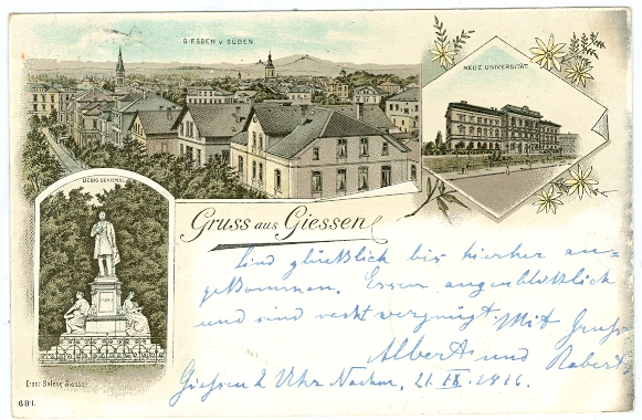 Giessen, Farb-Litho, 1896 postalisch gelaufen, frühe Karte, nur kleine Altersspuren.
