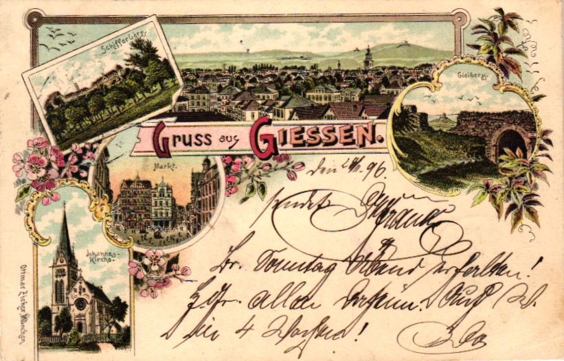 Giessen, Farb-Litho, 1896 nach Magdeburg versandt, frühe Karte mit nur sehr geringen Altersspuren.