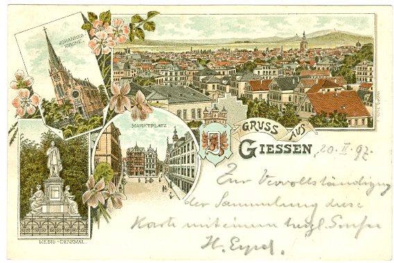 Giessen, Farb-Litho, 1897 von Giessen nach Darmstadt versandt, frühe Karte mit nur sehr geringen Altersspuren.