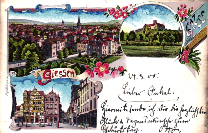 Giessen, Farb-Litho mit Marktplatz, 1900 von Giessen nach Grünberg versandt, hübsche Karte mit nur sehr kleinen Altersspuren.