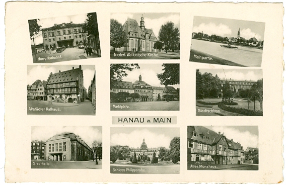 Hanau, AK mit 9 Ansichten (incl Bahnhof), 1940 von Hanau nach Vilshofen versandt, unten links leichter Eckbug, sonst nur geringe Altersspuren.
