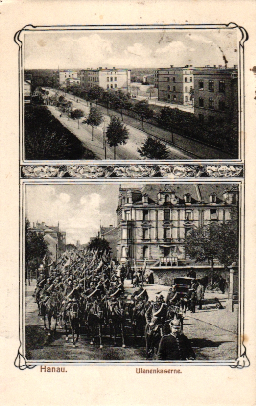 Hanau, Ulanenkaserne, 1918 nach Gelnhausen versandt, etwas Stempelspuren vorderseitig, kleiner Fleck unten rechts, sonst ordentliche Erhaltung.