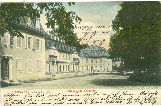 Hanau – Wilhelmsbad, Kurhaus und Restaurant, 1907 postalisch gelaufen, leicht eckbestossen, kleine Altersspuren.