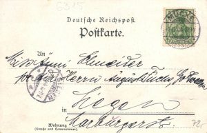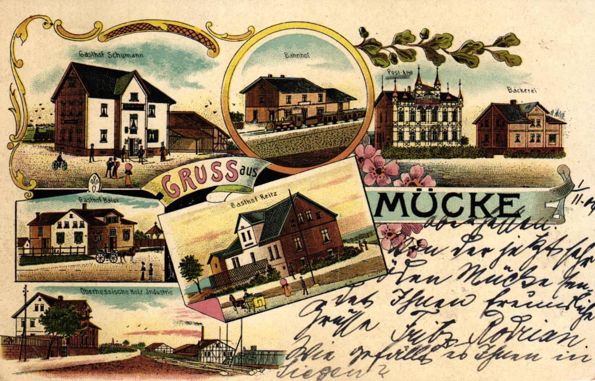 Mücke im Vogelsberg, Farb-Litho mit Gasthof „Schumann“ und Reitz sowie Baist, 1904 von Mücke nach Siegen versandt, gering eckrund, sonst einwandfreie Erhaltung. Seltene AK aus dem Vogelsberg !