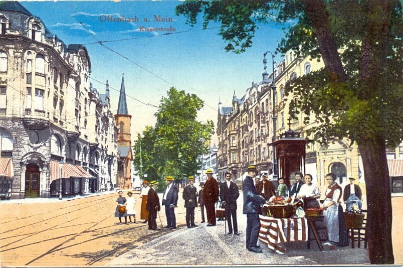 Offenbach am Main, Kaiserstrasse mit Verkaufsstand, 1916 als Feldpostkarte gelaufen, etwas eck- u. randbestossen, teilweise am Rand etwas nachcoloriert. Etwas seltenere Kaiserstrassen AK !