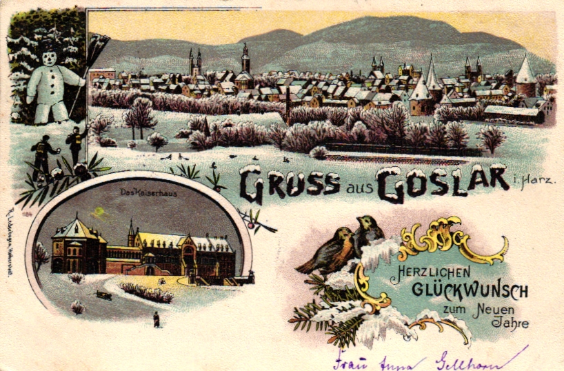 Goslar, Winterlitho mit Glückwünschen zum neuen Jahr, 1904 von Goslar nach Unna versandt,