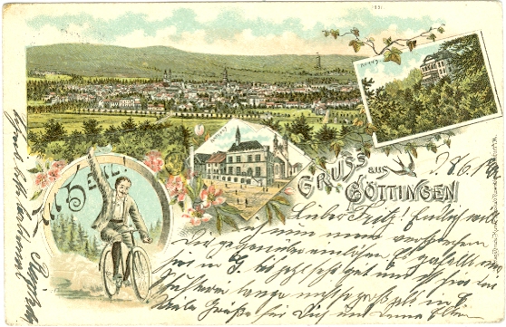 Göttingen, Farb-Litho mit Radfahrer „All Heil“, 1900 postalisch gelaufen, etwas eckbestossen, oben rechts größere Eckbüge, vorderseitig jedoch kaum störend und nur gering sichtbar.