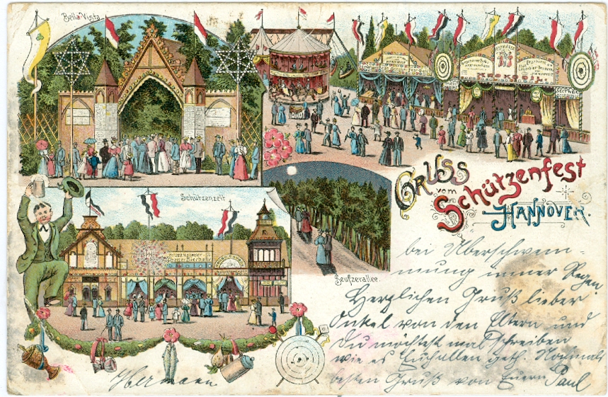 Hannover, Farb-Litho, Schützenfest, 1899 postalisch gelaufen, Briefmarke enfernt, kleiner Eckbug oben links, etwas größerer unten links, unten rechts leicht fleckig, schöne Karte in insgesamt noch ordentlicher Erhaltung.