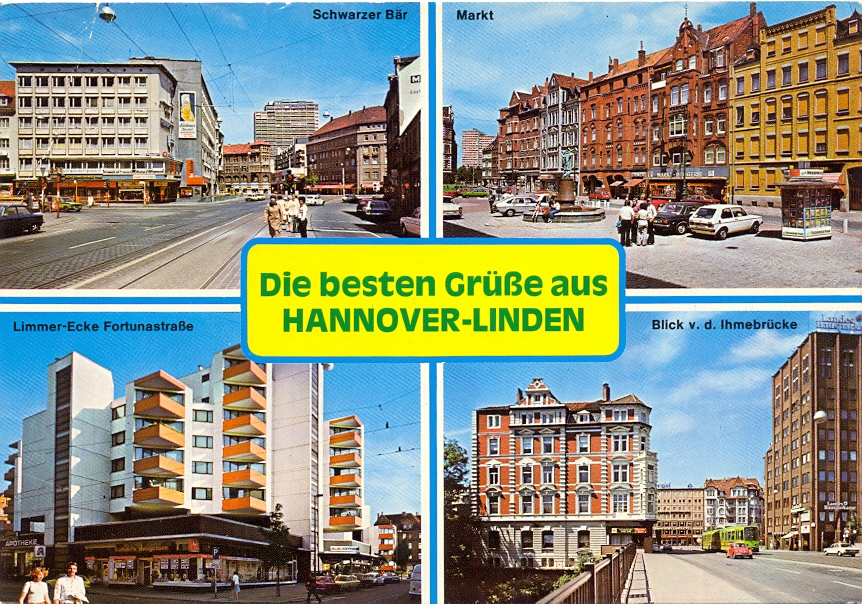 Hannover – Linden, ca. 70er J., vier interessante Ansichten, rückseitig gering beschriftet, nicht postalisch gelaufen, oben links zwei etwas größere Büge, jedoch sammelwürdig.