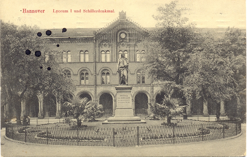 Hannover, Lyzeum I u. Schillerdenkmal, 1911 postalisch gelaufen, leicht eckbestossen, links oben Tintenspuren, sonst ordentliche Erhaltung.