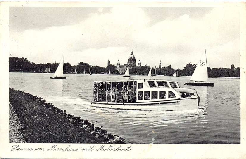 Hannover, Maschsee mit Motorboot, 1952 postalisch gelaufen, unten Mitte kleine Papieranhaftung, sonst nur kleinere Altersspuren.