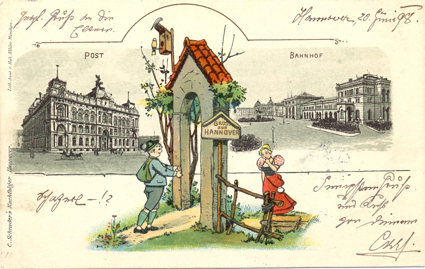 Hannover, Post u. Bahnhof, 1898 von Hannover nach Oldesloe gelaufen, schöne Karte in kombiniertem Druckverfahren, gute Erhaltung, nur sehr geringe Altersspuren.