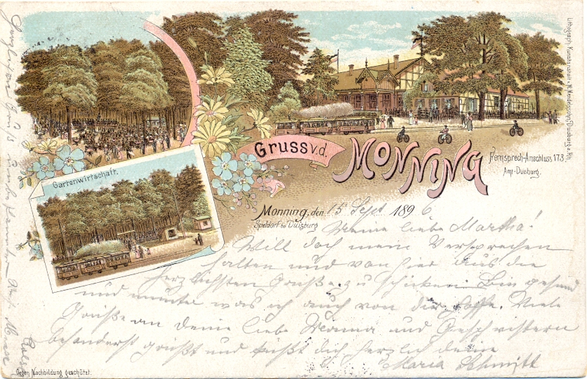 Duisburg – Monning, Farb-Litho, 1896 postalisch gelaufen (Poststempel von Speldorf), nur kleine Altersspuren.