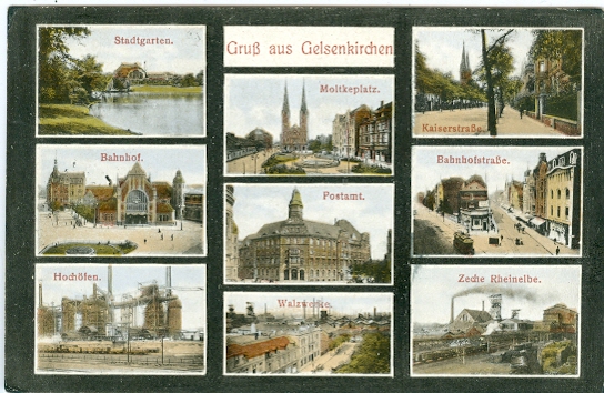 Gelsenkirchen, AK mit 9 kl. Ansichten, 1916 postalisch gelaufen, etwas eckbestossen, rückseitig leicht fleckig, insgesamt aber ordentliche Erhaltung.