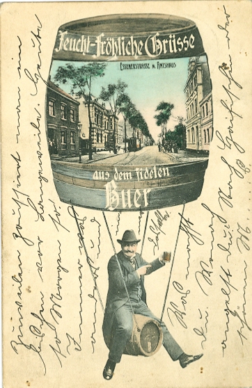 Gelsenkirchen – Buer, Bierfass als Balon, Essenerstrasse mit Amtshaus, 1907 postalisch gelaufen, kleiner und etwas größerer Eckbugansatz (kein starker Bug), leicht unsauber, etwas Altersspuren, seltene Karte in insgesamt noch ordentlicher Erhaltung.