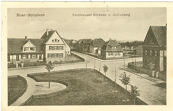 Gelsenkirchen Buer-Scholven, Feldhauser Strasse u. Juliusweg, 1922 postalisch gelaufen, Briefmarke entfernt, seltene Karte mit nur kleineren Altersspuren.
