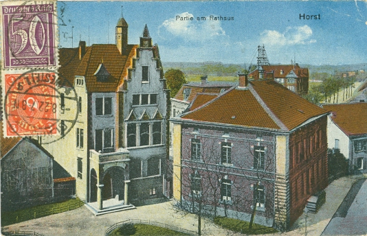 Gelsenkirchen – Horst, Partie am Rathaus, 1922 in Gladbeck versandt, oben rechts Eckbug, sonst nur kleinere Altersspuren.
