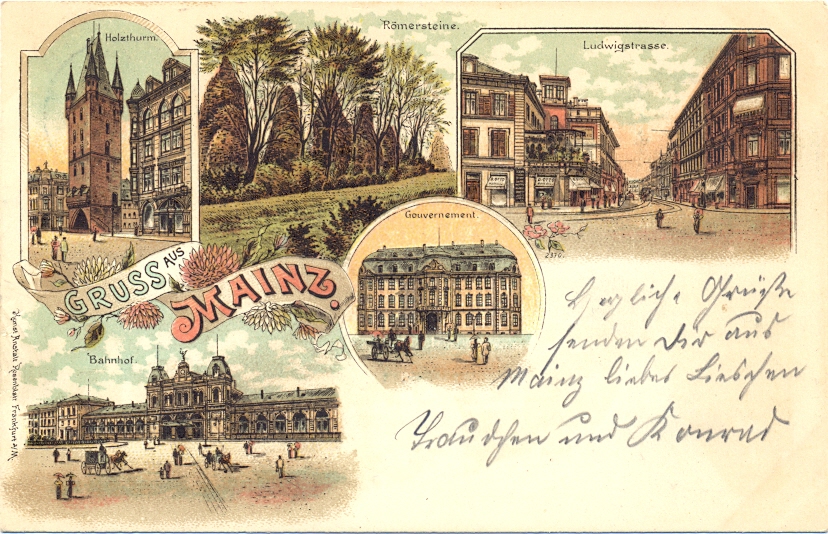 Mainz, Farb-Litho mit Bahnhof u. Ludwigstrasse, 1898 von Mainz nach Düren versandt, gute Erhaltung mit ebenso sauberer Rückseite und klaren Poststempeln.