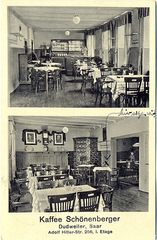 Dudweiler, Kaffee Schönenberger, 1938 postalisch gelaufen, Markenentwertung mit Sonderstempel von Dudweiler, seltene Karte mit nur kleinen Altersspuren.