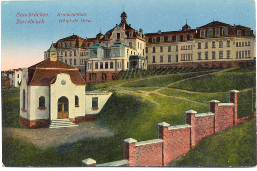 Saarbrücken, Krankenhaus, um 1910, nicht beschriftet, nicht gelaufen, etwas eckbestossen, sonst ordentliche Erhaltung.