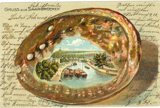 Saarbrücken, Muschel-Präge AK, 1904 postalisch gelaufen, nicht sehr häufige Saarbrücken AK, unten rechts sehr kleiner Eckbug, sonst nur geringe Altersspuren.