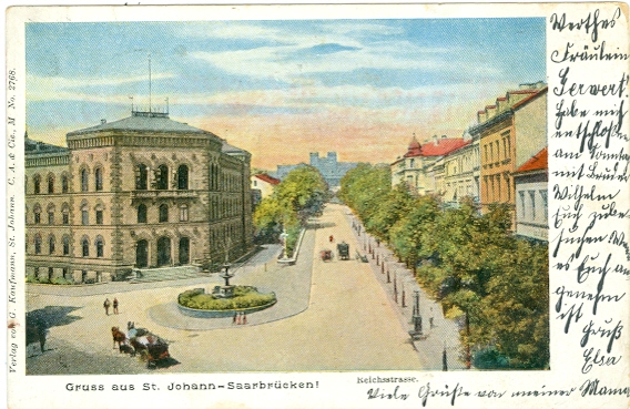 Saarbrücken, St. Johann, Reichsstrasse, 1902 postalisch gelaufen, kleine Altersspuren.