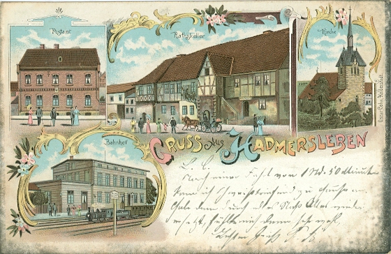 Hadmersleben, Farb-Litho, 1900 postalisch gelaufen mit Postamt und Bahnhof, seltene Karte in guter Erhaltung, lediglich etwas randoxidiert.