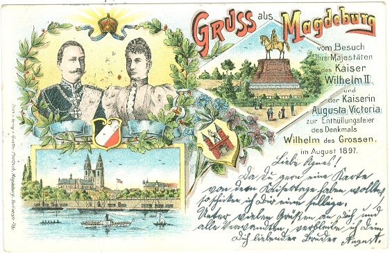 Magdeburg, Farb-Litho, Kaiserbesuch, 1897 postalisch gelaufen, versandt von Magdeburg nach Hakenstedt, nur sehr kleine Altersspuren.
