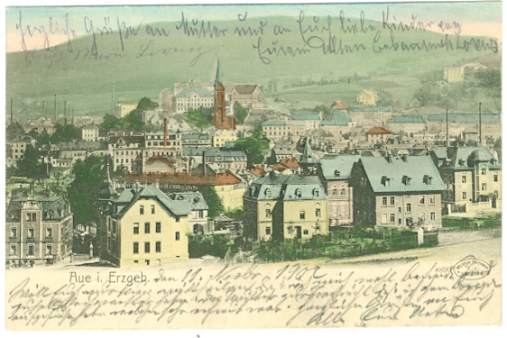 Aue im Erzgebirge, Gesamtansicht, 1902 postalisch gelaufen, nur geringe Altersspuren.