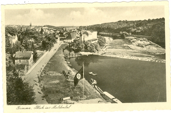 Grimma, Blick ins Muldental, 1942 postalisch gelaufen, im Vordergrund Hakenkreuz Flagge, vorderseitig einwandfreie Erhaltung, rückseitig zwei kleine Papieranhaftungen.