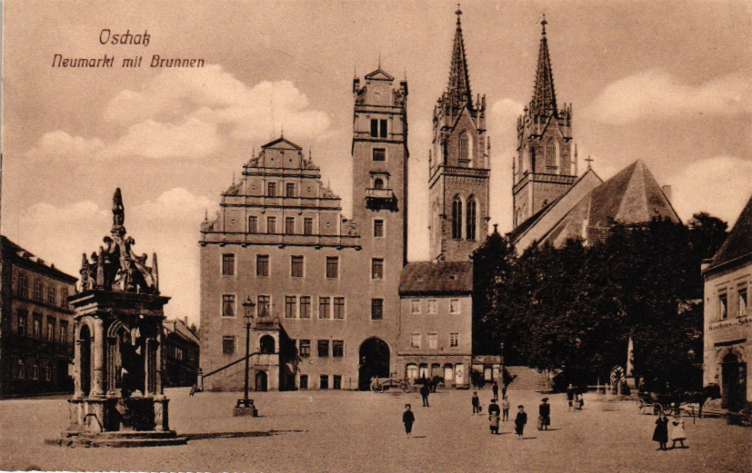 Oschatz, Neumarkt mit Brunnen, um 1910/20