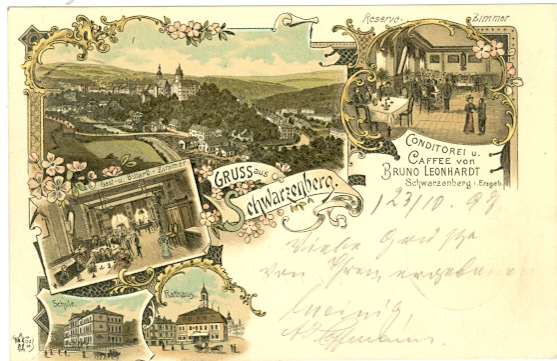Schwarzenberg, Farb-Litho m. Conditorei Leonhardt, Billardzimmer, 1897 postalisch gelaufen, unten links sehr leichter und wenig sichtbarer Eckbug, sonst einwandfreie Erhaltung.