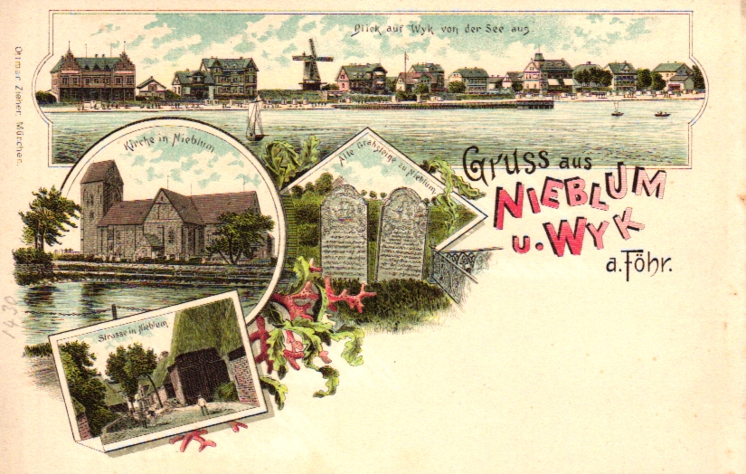 Nieblum und Wyk auf Föhr, Farb-Litho, um 1900/05, nicht beschriftet, nicht gelaufen, nicht beschriftet, nicht gelaufen, rechts minimal fleckig, sonst einwandfreie Erhaltung.