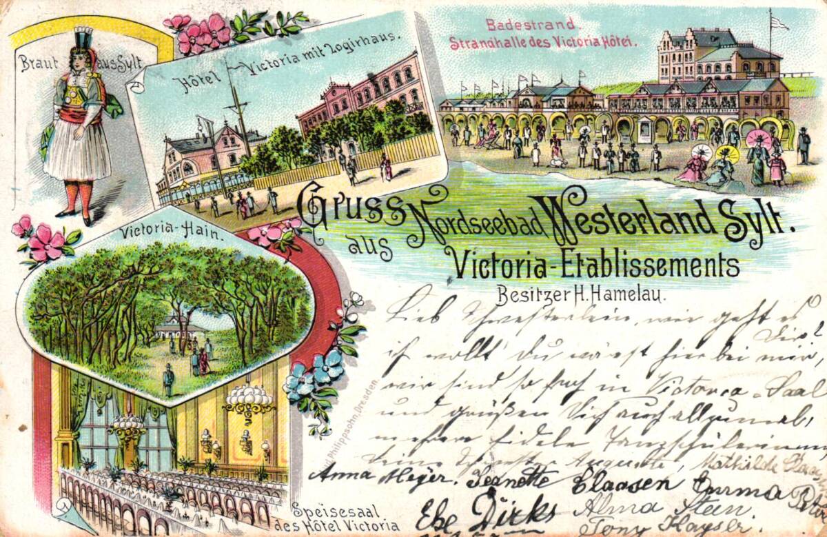Westerland / Sylt, Farb-Litho „Victoria-Etablissements“, 1898 nach Bordersholm versandt, leicht eckbestossen, sonst ordentliche Erhaltung.