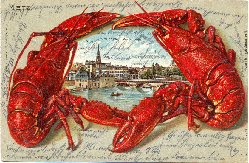 Metz, Mittelbrücke, Lobster Präge-AK, 1906 postalisch gelaufen, eine der beliebten und seltenen Lobsterkarten, nur sehr kleine Altersspuren.