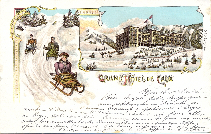 Caux / Montreux, Winterlitho mit Grand Hotel, 1901 postalisch gelaufen, Karte mit etwas aufgetragenem Glimmer, kleiner Eckbug, oben rechts kleiner Randfleck, sonst nur geringe Altersspuren.