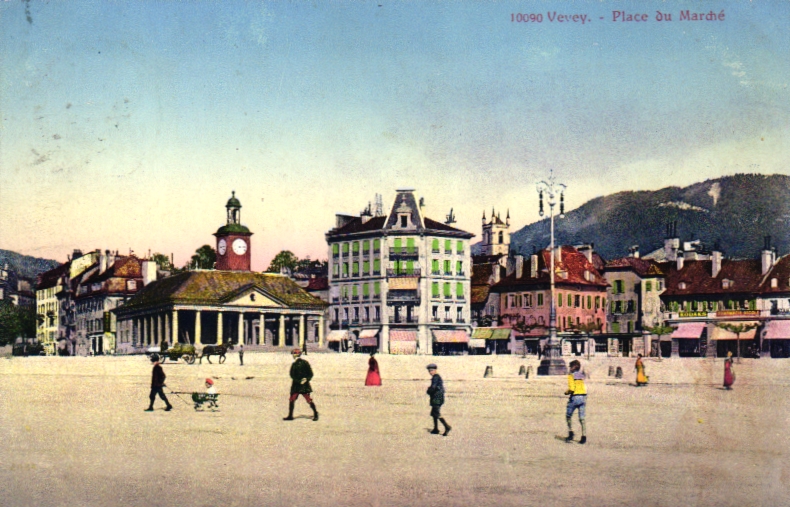 Schweiz, Vevey, Place du Marché, 1919 postalisch gelaufen, unten rechts leicht fleckig, sonst nur kleine Altersspuren.