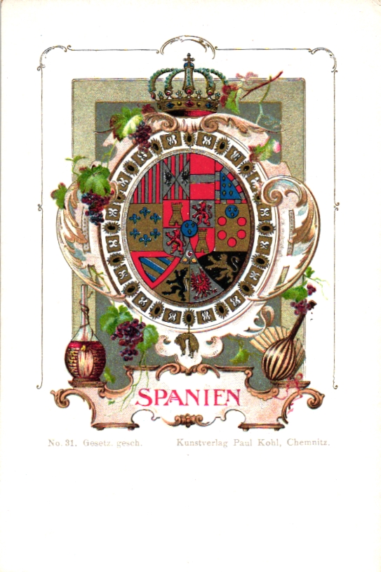 Spanien, Wappen-AK, Verlag Paul Kohl Chemnitz, um 1900/05, nicht beschriftet, nicht gelaufen, schöne Karte in guter Erhaltung, auch als Titelblatt für Briefmarkensammlungen sehr gut geeignet.