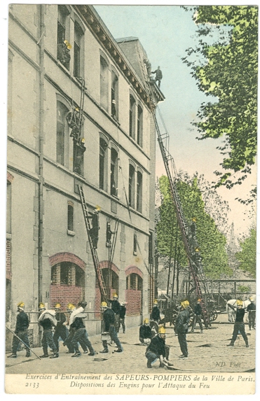 Feuerwehr, Übung der Feuerwehrleute in Paris, 1907, rückseitig mit Briefmarke und Poststempel versehen, ohne weiteren Text, interessante Karte mit nur geringen Altersspuren.