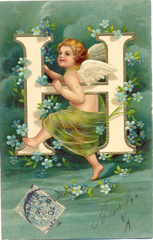 Engel, Buchstaben-AK „H“, Prägekarte, 1904 postalisch gelaufen, nur sehr kleine Altersspuren.