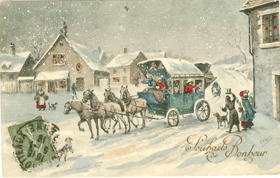 Kutsche, Winterlandschaft, Glückwunsch AK, 1918 postalisch gelaufen, Briefmarke vorderseitig, schöne Karte mit aufgetragenen Schneeflocken, oben rechts leichter Bugansatz, sonst einwandfreie Erhaltung.