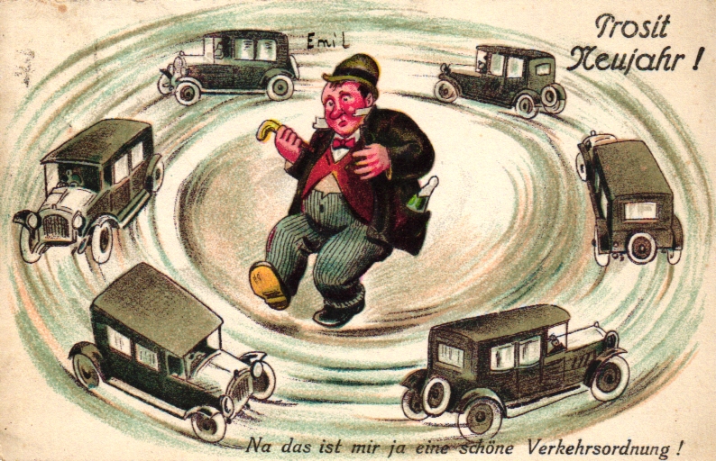 Neujahr, betrunkener Mann, Auto, Automobile, versandt in Mühlhausen / Thüringen, 1936, sehr schöner Poststempel, nur sehr kleine Altersspuren.
