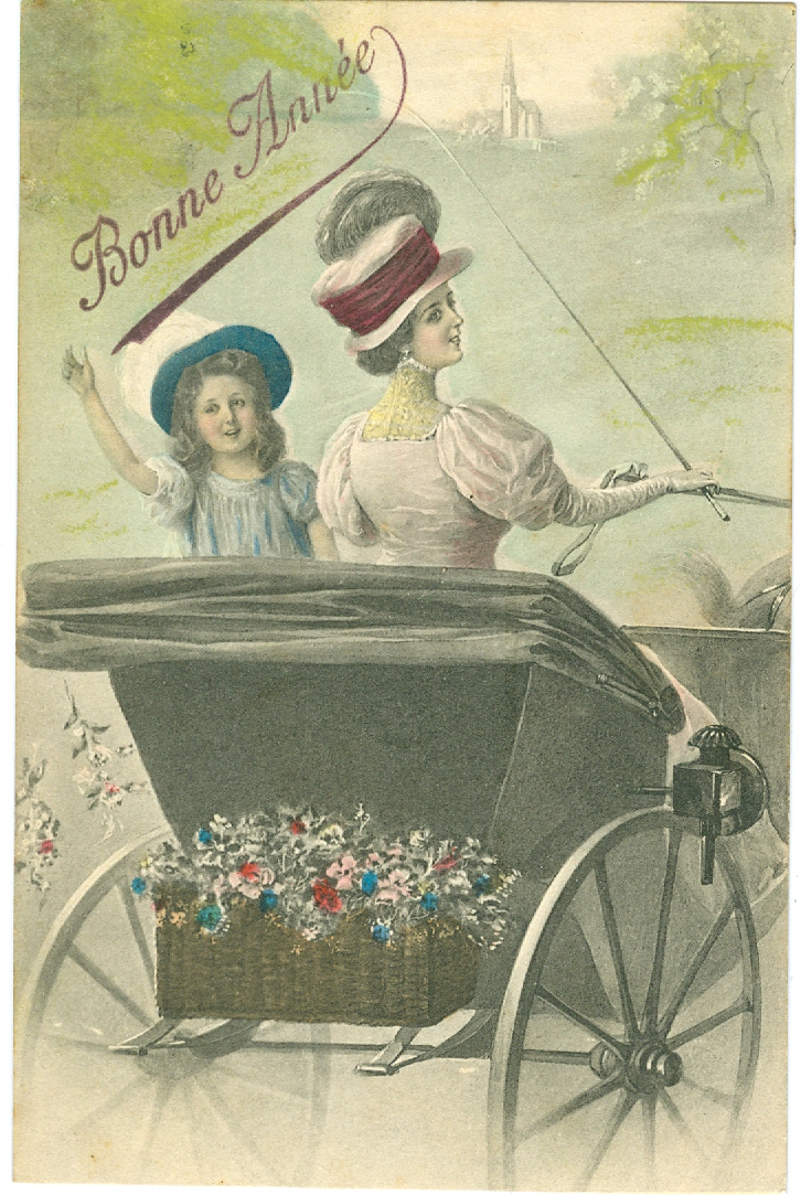 Neujahr, Damen in einer Kutsche, Jugendstil, 1914 postalisch gelaufen, vorderseitig angebrachte Briefmarke (oben links) entfernt, schöne Karte mit nur geringen Altersspuren.