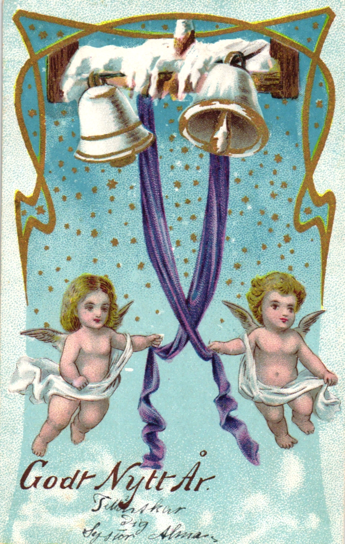 Neujahr, Engel, Glocken, Farb-Litho, um 1900/05, beschriftet, nicht postalisch gelaufen, nur sehr kleine Altersspuren.